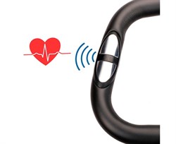 Сенсорные датчики пульса расположены на поручнях. Монохромный дисплей показывает: время, расстояние, скорость, калории и пульс. На консоли расположен держатель для планшета.