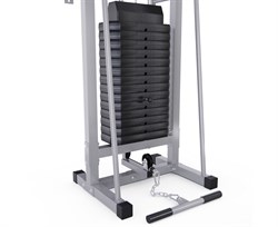 Нагрузку можно отрегулировать до 89,8 кг, в комплекте 14 весовых блоков по 6 кг и 1 на 5,8 кг.
