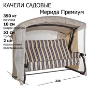 Вершина нашей модельной линейки - 4-х местные садовые качели Империя. Длина сидения – 200 см. Угол наклона спинки регулируется пошагово, при этом качели можно разложить полностью на 180 градусов. Текстильный комплект качелей изготовлен из плотной и прочной полиэфирной ткани (PE Outdoor), с водо- и грязеотталкивающими свойствами.Тент с антимоскитной сеткой с угловыми вставками из тентовой ткани.