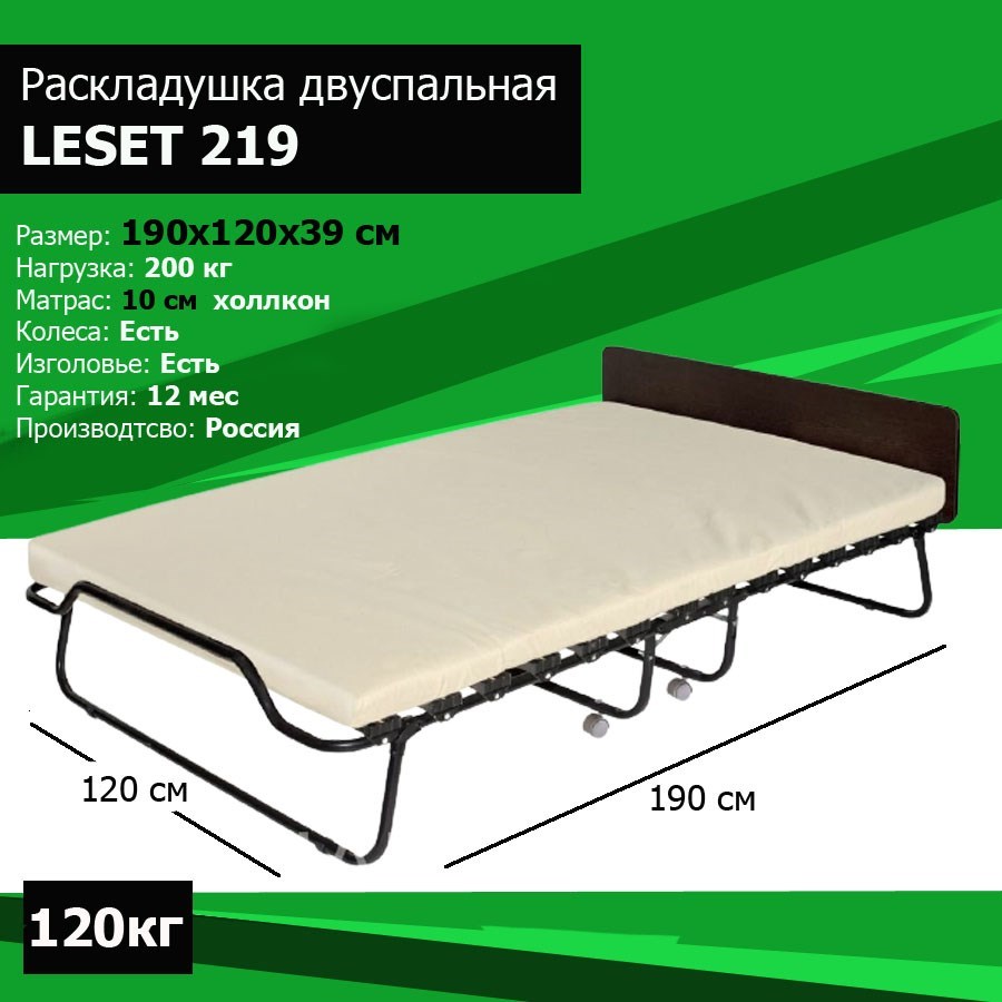Двухспальная раскладушка с матрасом Leset Модель 219  состоящим из полужесткого холконового листа (толщина 80-90 мм). Материал основания кровати Leset 219- 14 обработанных утолщенных ламелей. Спальное место 1200х1900 мм. Столешница (тумба) выполнена из ДСП (цвет (венге). Размеры кровати Leset 219 в упаковке 1200х360х1120мм. Диаметр трубы - 25 мм с круглым сечением. Допустимая нагрузка на кровать Leset 219 до 250 кг (Внимание! Указана максимально допустимая распределенная нагрузка в статическом состоянии). Круглый усиленный профиль трубы (1,5 мм), ширина кровати 1,2 метра, наличие верхней столешницы, колесики для удобства транспортировки, эргономичный продольный фиксатор матраца, съемный высокий матрац с липучками.