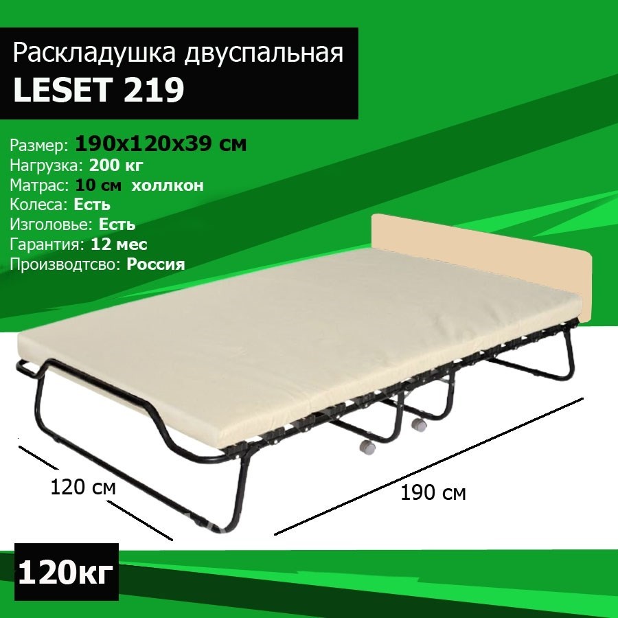 Двухспальная раскладушка с матрасом Leset Модель 219  состоящим из полужесткого холконового листа (толщина 80-90 мм). Материал основания кровати Leset 219- 14 обработанных утолщенных ламелей. Спальное место 1200х1900 мм. Столешница (тумба) выполнена из ДСП (цвет (венге). Размеры кровати Leset 219 в упаковке 1200х360х1120мм. Диаметр трубы - 25 мм с круглым сечением. Допустимая нагрузка на кровать Leset 219 до 250 кг (Внимание! Указана максимально допустимая распределенная нагрузка в статическом состоянии). Круглый усиленный профиль трубы (1,5 мм), ширина кровати 1,2 метра, наличие верхней столешницы, колесики для удобства транспортировки, эргономичный продольный фиксатор матраца, съемный высокий матрац с липучками.