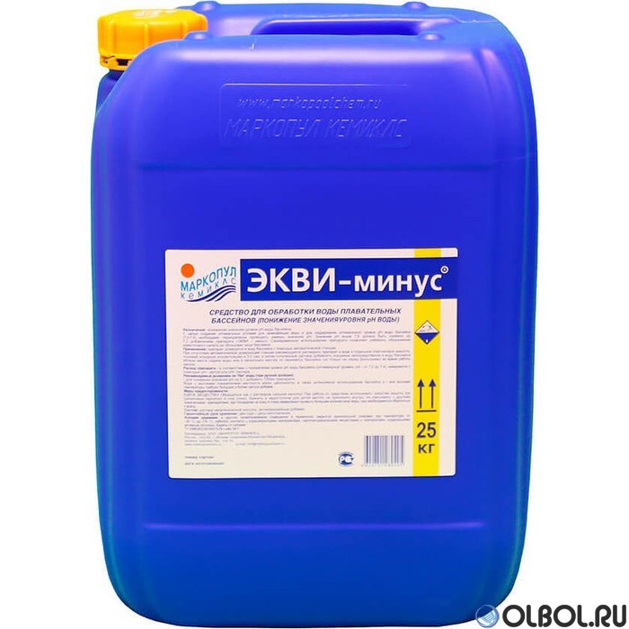 Для поддержания оптимального уровня рН воды бассейна (7,0 – 7,4) необходимо проводить замеры уровня рН и соответственно корректировать состав воды. Значение рН выше 7,6 должно быть снижено до 7,2 добавлением препарата «Экви-минус». Своевременное использование препарата позволяем избежать образования известкового налета. Препарат добавляется порциями непосредственно в воду бассейна, вблизи места подачи, или в нескольких местах одновременно (но только не перед фильтрами).