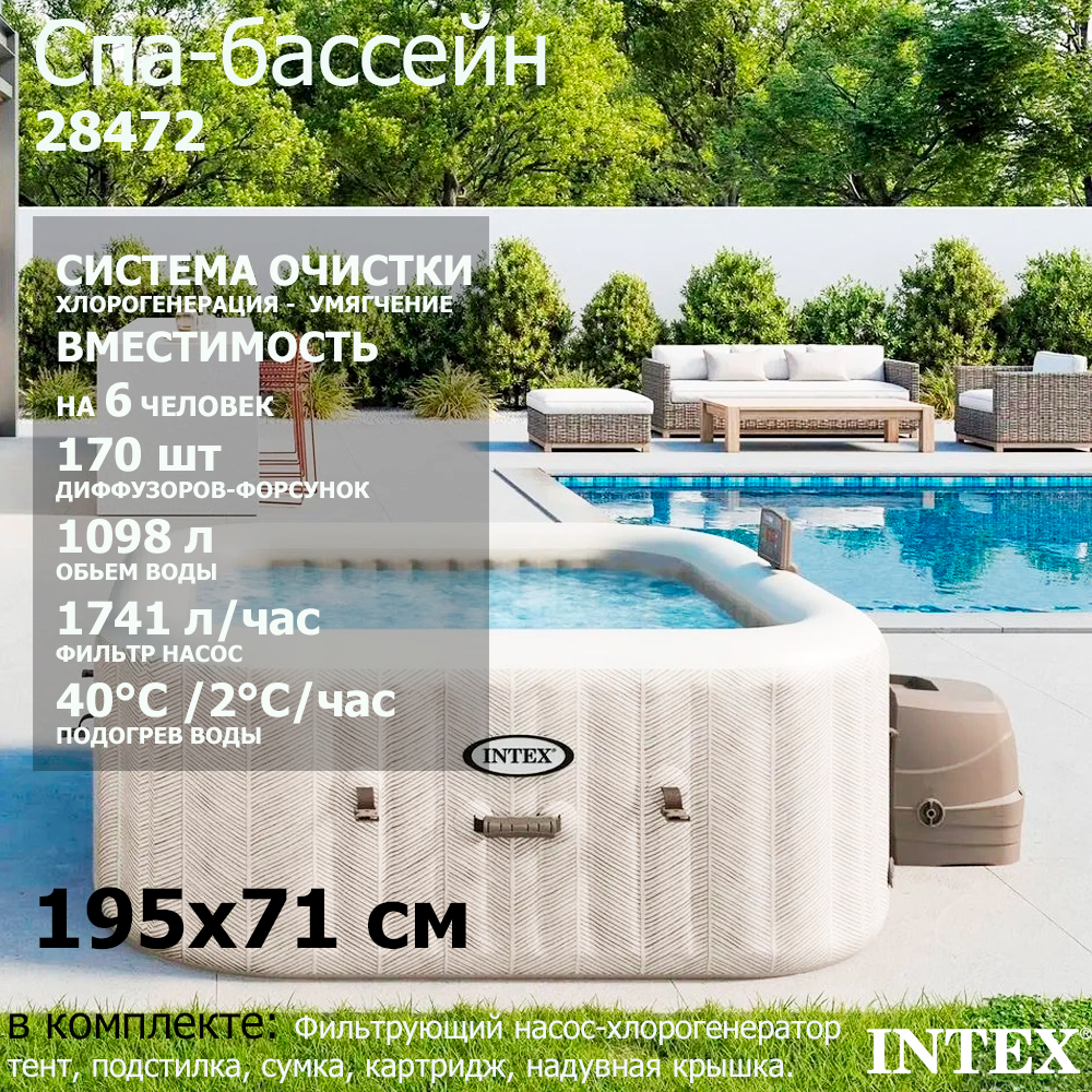 Надувная гидромассажная джакузи Intex 28472 Chevron Deluxe Square на 6 мест, 195 x 195 x 71 см Стильный дизайн, прямо у вас под рукой! Идеально подходит для расслабления в окружении бодрящего пузырькового массажа. Управляйте всеми функциями PureSpa одним нажатием кнопки благодаря перезаряжаемой беспроводной панели, которую можно разместить на краю ванны Изготовлена из высококачественного 3-слойного сверхпрочного ламинированного ПВХ. Внутренняя отделка выполнена из запатентованной технологии FiberTech, тысяч полиэфирных нитей, которые придают PureSpa исключительную прочность: благодаря этой технологии стенки надувной ванны намного более устойчивы и прочны Встроенный подогрев для установки идеальной температуры воды (10°C-40°C), а также система жесткой и соленой воды, которая предотвращает образование известкового налета и облегчает уход за водой. В комплект поставки входят все необходимые аксессуары для полноценного использования: сумка для переноски; основание, на которое можно установить ванну; крышка для предотвращения потери тепла и защиты воды от скопления мусора; два картриджа для фильтрации воды.