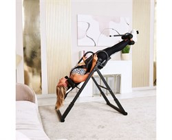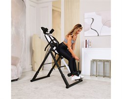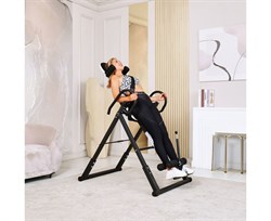Инверсионный стол DFC IT6312A-B — это удобный и эффективный тренажёр для улучшения осанки, укрепления связок и улучшения кровообращения. Он имеет спинку чёрного цвета с валиками под голову и съёмную подушку под поясницу для дополнительного комфорта. Страховочный ремень входит в комплект, двойные валики для удобства использования.