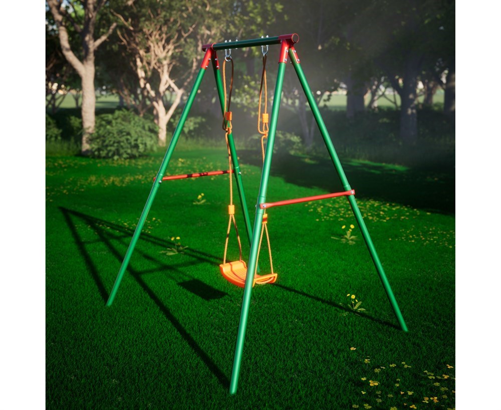 Основу конструкции составляет стальной профиль 45x1,5 мм и дополнительные ребра жёсткости — все это придаёт качелям повышенную прочность (максимальная нагрузка — 35 кг) и устойчивость на любой поверхности, поэтому их разрешено использовать детям от 3 лет. Порошковое покрытие позволяет качаться на качелях даже в самую жаркую погоду и защищает от солнечных лучей.