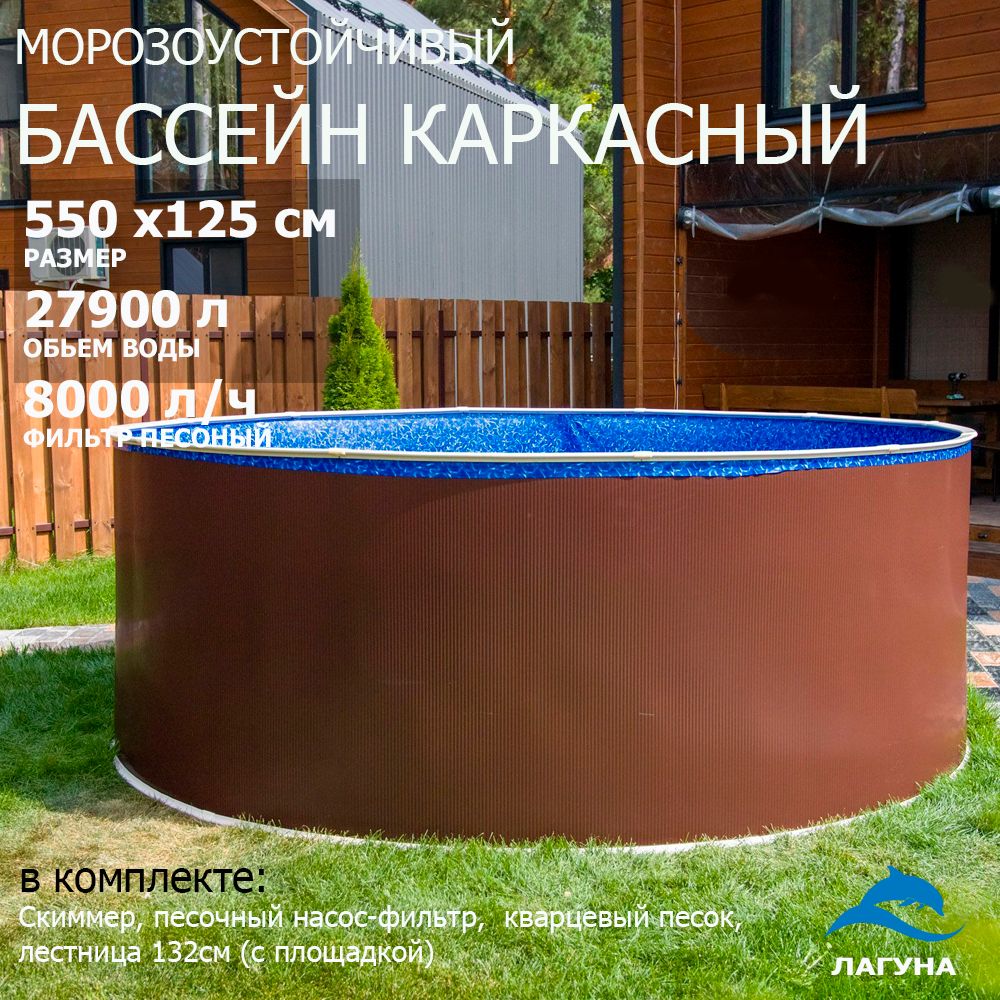 Морозоустойчивый бассейн Лагуна 5,0 х 1,25м- коричневый, пленка мрамор 0/4 мм / + скиммер, фильтр песочный, лестница, песок