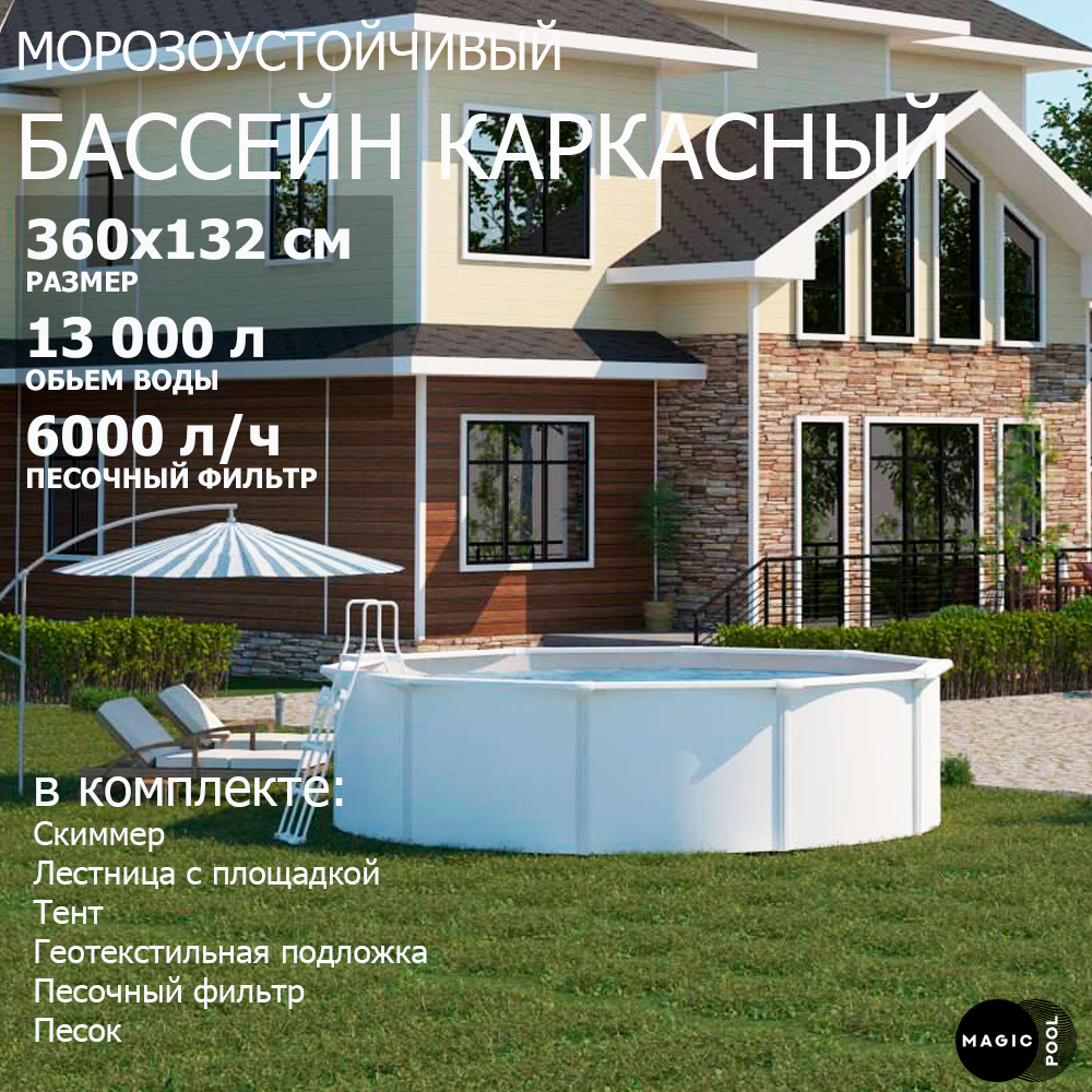 Морозоустойчивый бассейн MAGIC POOL / 360х132 см / скиммер, тент, подложка, песочный фильтр / цвет белый / KITPR3613
