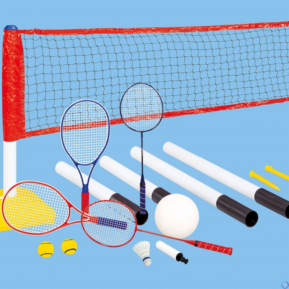Комплект для игр на природе. В комплекте складная сетка, которую можно настроить для игры в теннис, бадминтон и волейбол. Это возможно благодаря возможности изменить высоту сетки. В качестве утяжелителя используются ёмкости, в которые нужно налить воду. Также в комплекте идёт 2 ракетки для тенниса, два мячика для тенниса, два ракетки для бадминтона и воланчик к ним, мяч для волейбола и насос к нему |