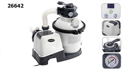 Песочный фильтр насос для бассейн Intex 26642 Sand Filter Pump, модель SX925 – новинка этого сезона. Подходит к круглым бассейнам диаметром от 183 см и до 457 см, а также прямоугольным бассейнам размером до 450×220 см. Песочные насос – фильтры требуют минимального обслуживания. Песок необходимо менять один раз в несколько лет. По сравнению с обычными фильтрующими насосами, использующими сменные фильтры- картриджи и обеспечивающими слабую очистку воды, песочные фильтры очищают воду в 4 раза эффективнее. Насос имеет 6 режимов работы и встроенный 24-часовой таймер, подключается к штатным отверстиям бассейна при помощи двух гофрированных шлангов.