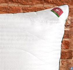 Подушка выполнена из ткани 100 % хлопка сатин с тиснением страйп в белом цвете, отделка по краю подушки кантом травяного цвета, фирменная упаковка конверт ПВД, спанбонд.