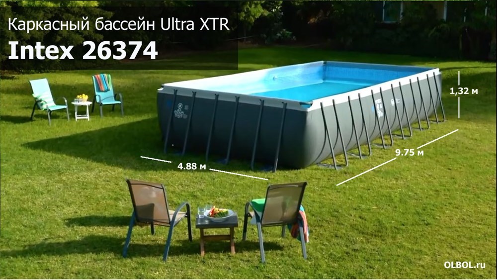 Intex 26374 / Прямоугольный каркасный бассейн / 975x488x132 / Ultra XTR Rectangular Frame песочный фильтр 10500 л/ч, тент, подстилка, лестница