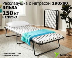 Надежная раскладушка с матрасом Эльза лидер по продажам от мебельной московской компании MOHSEN! Он обладает большим запасом прочности, что связано с отличным каркасом из трубы диаметром 25 мм и основанием спального места из итальянской панцирной сетки на пружинах. Раскладушка спокойно выдержит крупного человека – ее допустимая нагрузка 150 кг. Матрас с чехлом из поликоттона с наполнителем из холлкона который всегда можно постирать, сделают отдых ваш или ваших гостей приятным и комфортным. В сложенном виде кровать Эльза можно убрать в самое узкое место, недоступное постороннему глазу.