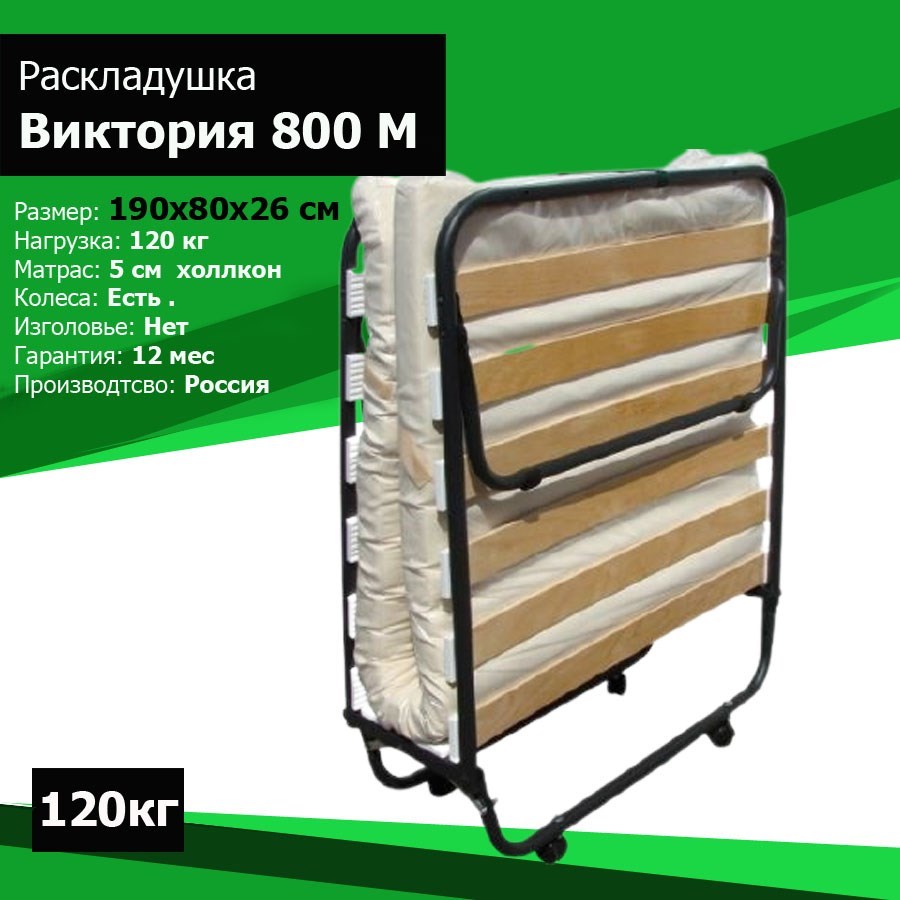 Раскладушка с матрасом Виктория 800 М — одна из успешных моделей среди подобных кроватей, имеющая идеальное соотношение «функциональность — цена». Это удобное и просторное спальное место. За комфорт отдыхающего отвечают мягкий матрас и качественная основа.