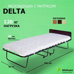 Раскладушка / складная кровать с матрасом DELTA, состоящим из полужесткого холлкона цельного листа толщиной 90-100 мм. Материал основания кровати Элеонора М - 14 обработанных утолщенных ламелей. Размер складной кровати "Элеонора М" ширина 90 см на 200 см. Столешница (тумба) выполнена из ЛДСП. Прямоугольный усиленный профиль трубы, длина кровати 2 метра, наличие верхней столешницы, эргономичный продольный фиксатор матраца, съемный высокий матрац. Съёмный ткань матраса на молнии