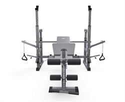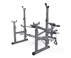 В комплект также входят съёмные валики, ручка для тяги на цепи и эспандеры на цепи, что позволяет разнообразить упражнения и повысить эффективность тренировок. Высота стоек под штангу варьируется от 84 до 115,5 см, а расстояние между стойками можно настроить под себя в диапазоне от 77,5 до 105,5 см.