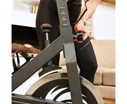 Спин-байк оснащен маховиком весом 15 кг и колодочной системой нагрузки. Регулировка нагрузки происходит механически и использует бесступенчатую систему с множеством уровней нагрузки. Таким образом, вы можете выбрать подходящий уровень нагрузки для своих потребностей.