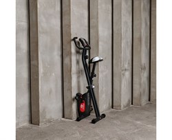 Конструкция велотренажера складная, что позволяет легко его хранить и транспортировать. Тренажер оборудован компенсаторами неровностей пола для стабилизации и карманом для хранения мелких предметов.